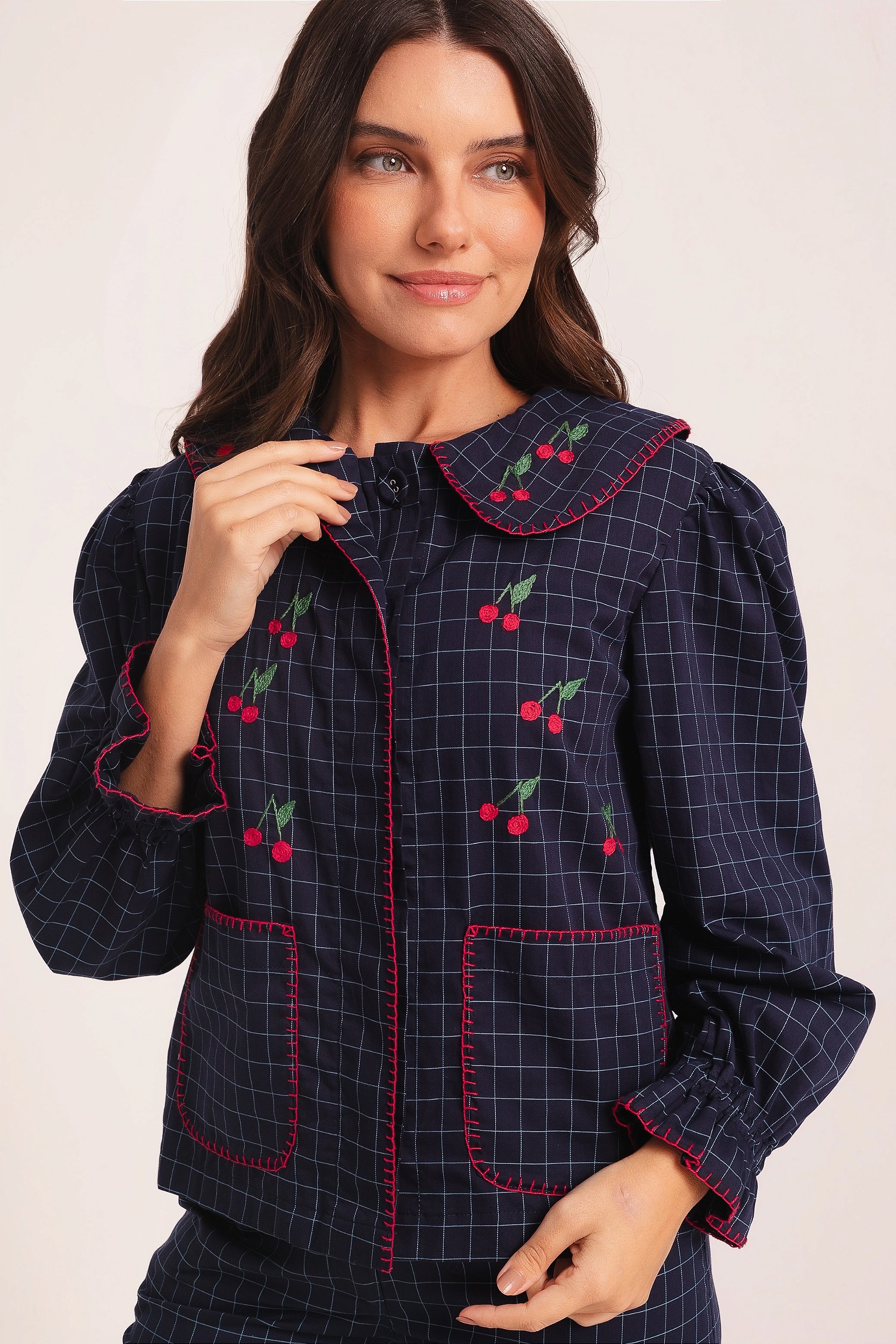 O Casaqueto cerejas bordado é um encanto em forma de roupa. Confeccionado em tecido 100% algodão, ele recebe bordados manuais de cerejas e o contorno em ponto aranha que abraça toda a peça com delicadeza. Os botões forrados completam o charme,enquanto a modelagem feminina traz leveza e graça ao vestir. É uma peça exclusiva , pensada para atravessar gerações.