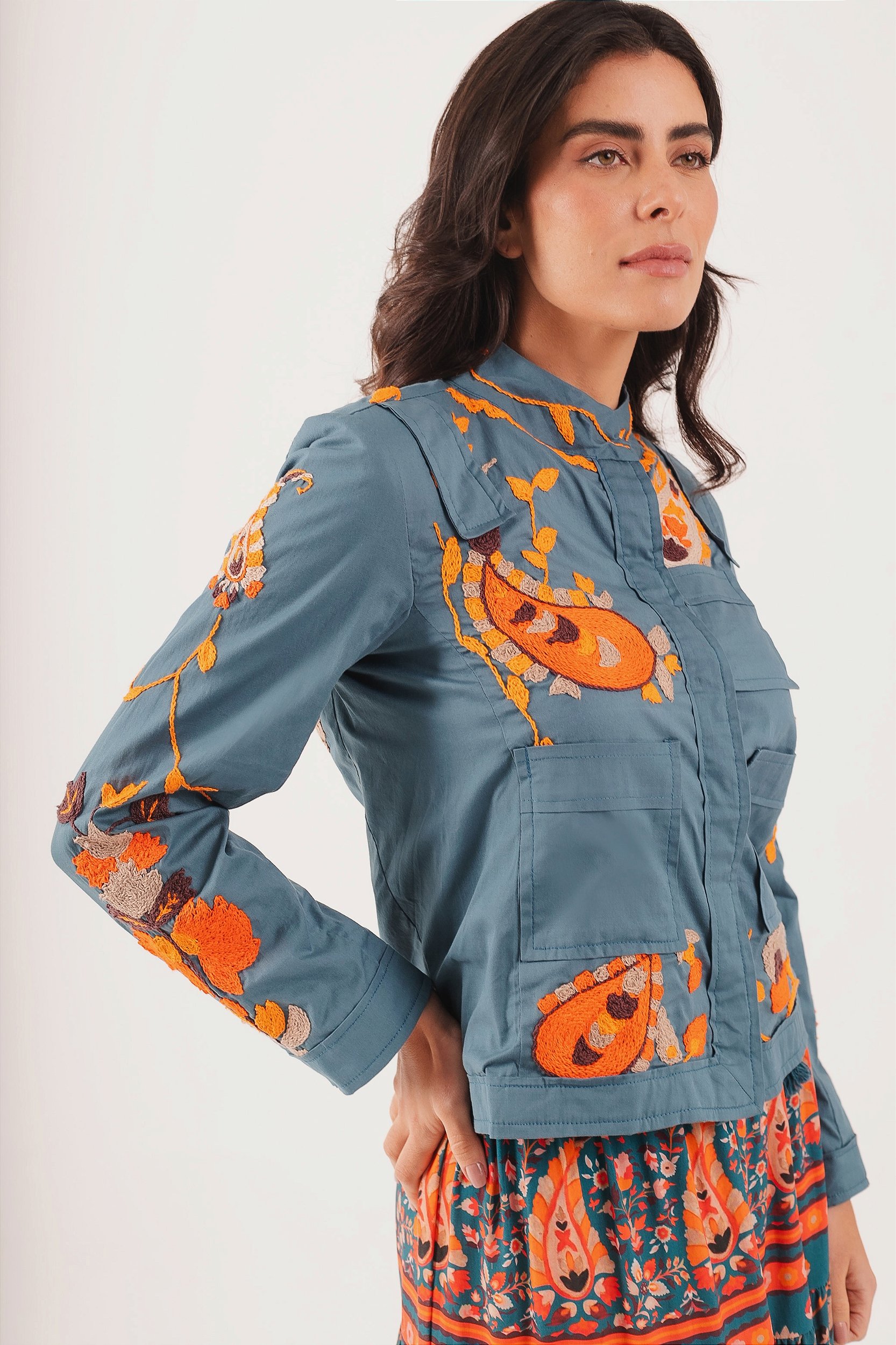 A Jaqueta bordada Mira é um produto super exclusivo da Lulyra Brand. Fabricada em tecido 100% algodão, toda bordada a mão em elementos que compõem a estampa Mira e para completar é toda forrada com a estampa Mira na parte interna.