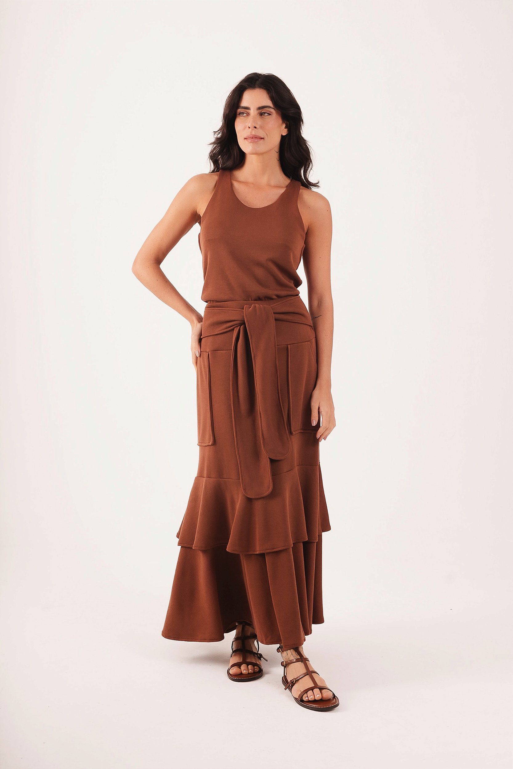 A SAIA TRICÔ LAÇO é aquela peça super coringa e atemporal. Com uma modelagem perfeita , caimento lindo com os babados e pala larga que adere bem a cintura.